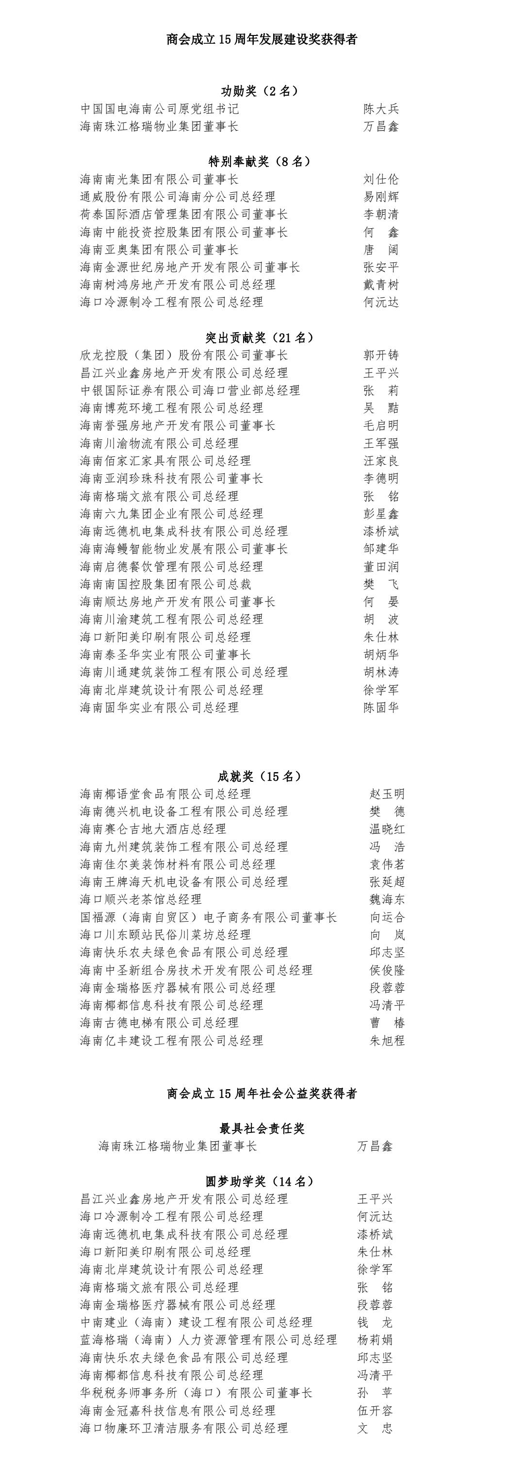 附:海南省四川商会成立15周年发展建设奖和社会公益奖获得者名单