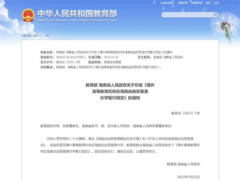 日前,教育部联合海南省政府研究制定了《境外高等教育机构在海南自由贸易港办学暂行规定》。该《规定》贯彻落实《中华人民共和国海南自由贸易港法》《海南自由贸易港建设总体方案》,系统设计了境外高等教育机构在海南自由贸易港办学的基本规则。