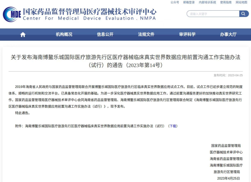 为进一步深化医疗器械真实世界数据应用工作,通过前置沟通服务更好的加快推动真实世界研究工作,国家药品监督管理局医疗器械技术审评中心会同海南省药品监督管理局、海南博鳌乐城国际医疗旅游先行区管理局联合制定《海南博鳌乐城国际医疗旅游先行区医疗器械临床真实世界数据应用前置沟通工作实施办法(试行)》。